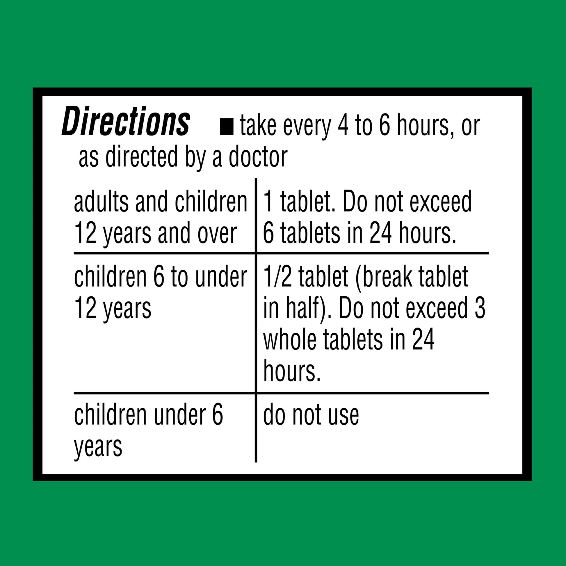 Adults and children over 12: Take 1 tablet every 4–6 hours as needed. Do not exceed 6 tablets in 24 hours. Consult a healthcare professional before use if pregnant, breastfeeding, or taking other medications.