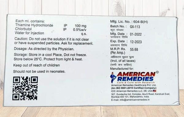 Thiamine Injection IP 100mg - American Remedies 10 ampoules